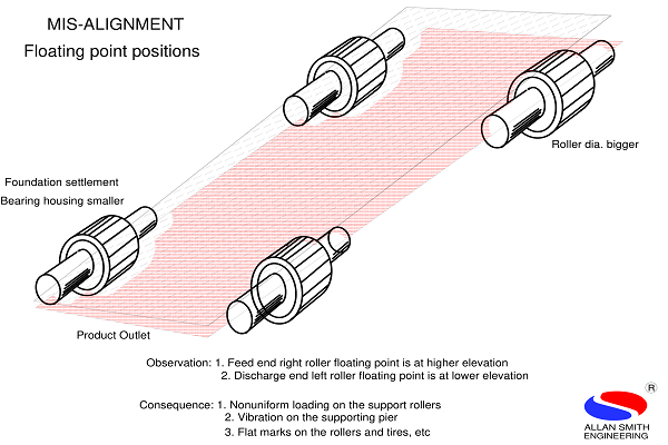 Point of contact of Tyre & rollers. The point various or float upon the change in support roller diameter on the position. The ideal points of all the four rollers positions should fall on a plan. And the change in the difference in the point on vibration. However, if points are not in a plan it results in vibration in hot bearing & starts of mechanical problem in the kiln.